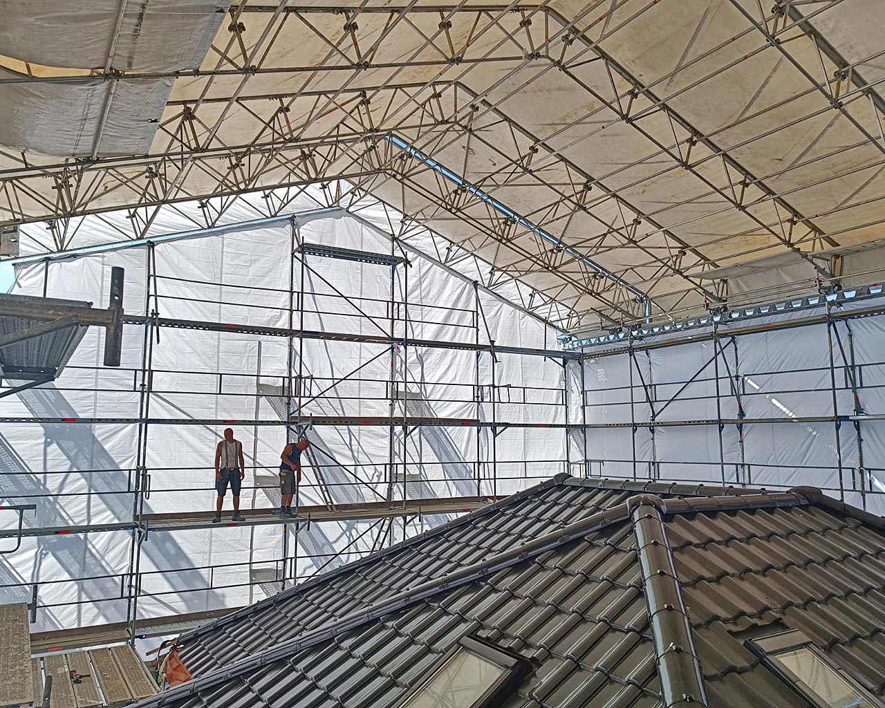 Ein Wetterschutzdach ist eine temporäre Überdachung auf einem Gerüst, die als wetterunabhängiger Schutz für Handwerker, Baustoffe und Fassaden dient. Es schützt bei Regen, Schnee, Frost oder intensiver Sonneneinstrahlung und ermöglicht so den kontinuierlichen Bauprozess ohne Verzögerungen durch Witterungseinflüsse.